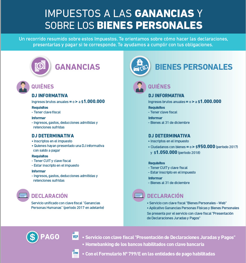 Aquellos que se encuentren obligados a presentar Declaración Jurada Determinativa del Impuesto a las Ganancias correspondiente al período 2017 deberán realizarla exclusivamente a través del nuevo servicio con clave fiscal Ganancias Personas Humanas. Los sujetos previstos en la Resolución General N°2.151 (excepto las sociedades indicadas en su Artículo 30) deberán confeccionar sus Declaraciones Juradas del Impuesto sobre los Bienes Personales a través del servicio denominado Bienes Personales Web.